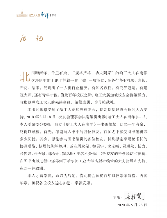 從北國(guó)到南洋,千裡(lǐ)之外。哈工大人在南洋這(zhè)塊陌生的土地上憑著(zhe)一股幹勁兒、一股闖勁兒,在各行各業紮根、成(chéng)長(cháng)、開(kāi)花、結果。哈工大在他們身上打下了深深的烙印。在異國(guó)他鄉的土地上,他們心懷祖國(guó),心懷母校,希望他們寫下的故事(shì),能(néng)激勵更多未來的哈工大學(xué)子努力奮鬥、自強不息,續寫下一個百年的精彩故事(shì)。