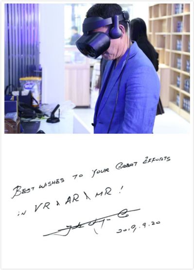 圖片說明:高博士體驗“嫦娥”三号虛拟現實展示系統,并簽字留言