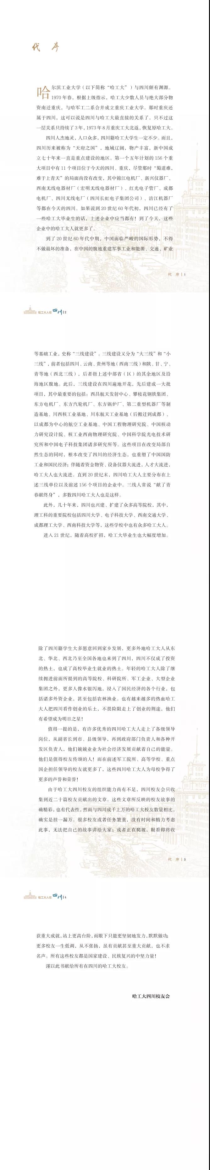 在這(zhè)些優秀校友中,有這(zhè)樣(yàng)一群人,他們紮根在祖國(guó)西南的“天府之國(guó)”——四川。值此百年校慶之際,哈工大四川校友會(huì)的校友們,傾情編寫了“建校百年·哈工大人系列叢書”中的《哈工大人在四川》一書。以此作爲對(duì)母校的生日獻禮。