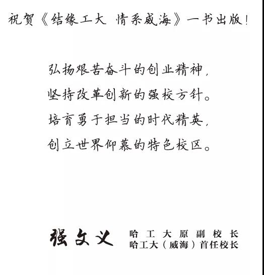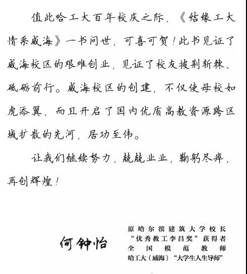 哈工大老校長(cháng)、哈工大(威海)校友理事(shì)會(huì)名譽理事(shì)長(cháng)楊士勤教授和哈工大副校長(cháng)、威海校區校長(cháng)徐曉飛教授分别爲本書作序;哈工大原副校長(cháng)、威海校區首任校長(cháng)強文義教授和原哈爾濱建築大學(xué)校長(cháng)、哈工大“優秀教工李昌獎”獲得者、威海校區“大學(xué)人生導師”何鍾怡教授爲本書寄語;哈工大(威海)黨委姜波書記多年來對(duì)校友給予無私的關懷與付出;曲世友副校長(cháng)對(duì)本書編寫組織的工作給予了大力支持;校區各部門、各院系和校友們對(duì)編委會(huì)積極響應與支持……這(zhè)一切促成(chéng)了本書的順利出版,爲哈工大建校百年獻禮!